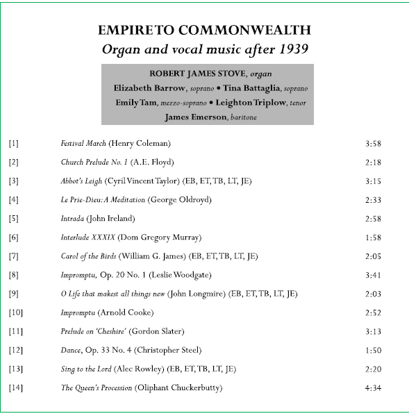 Creations by Oliphant Chuckerbutty, Henry Coleman, Arnold Cooke, John Ireland, Dom Gregory Murray, George Oldroyd, Alec Rowley, Gordon Slater, Christopher Steel, Cyril Vincent Taylor, and Leslie Woodgate are all to be heard on Empire to Commonwealth. The result will give listeners new insights into unduly overlooked repertoire.